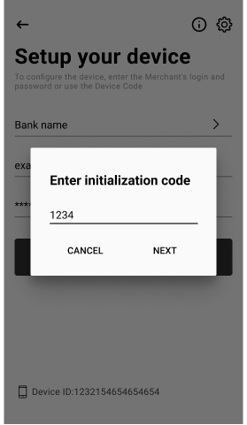 * При успешном вводе реквизитов Приложение запросит ввести `код инициализации` (4 цифры). Введите его в соответствующее поле и продолжите вход.&#x20;