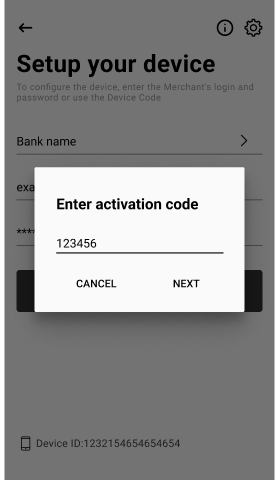 Если нужно активировать платежный терминал с определенным идентификатором, то вам необходимо воспользоваться настройкой устройства с помощью [Кода устройства](#nastroika-ustroistva-s-pomoshyu-koda-ustroistva)