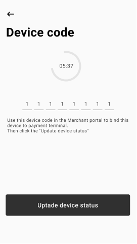 * Если `Код устройства` успешно введен на портале Торговца, то на мобильном устройстве нажмите кнопку `Обновить статус устройства` для того чтобы завершить настройку.